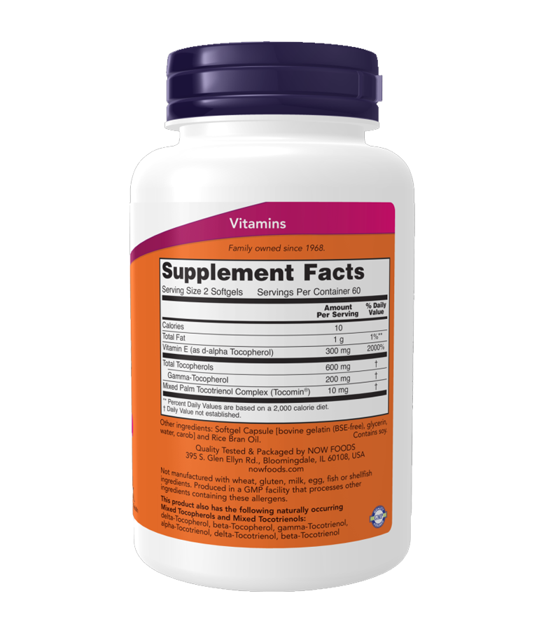 NOW® Advanced Gamma E Complex is a full-spectrum vitamin E supplement that features gamma-tocopherol and includes the right balance of tocopherols and tocotrienols. Gamma-tocopherol, the most abundant relative of vitamin E in the diet, is especially important due to its unique ability to detoxify and eliminate reactive nitrogen species, a particularly destructive form of free radical.