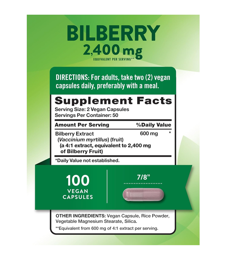 Each serving of our Bilberry capsules provides the equivalent of 2,400 mg of Bilberry (Vaccinium myrtillus) fruit.** This vegan formula makes it simple for adults to receive herbal support and is especially beneficial to those who may dislike the taste of bilberries.