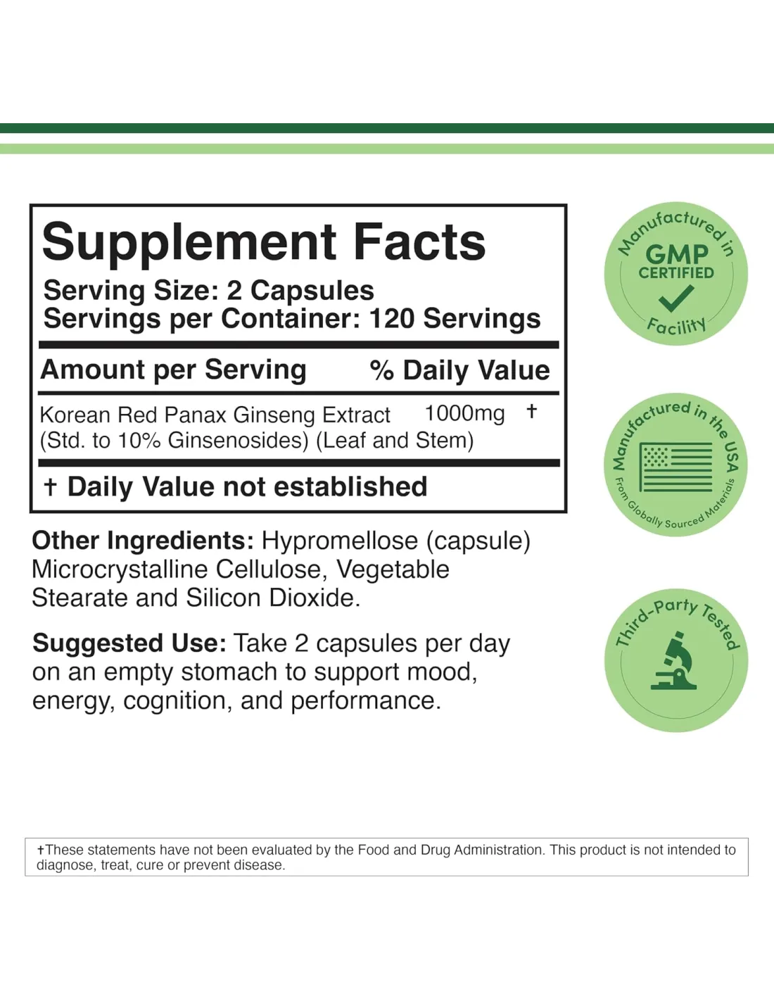 Korean Panax Ginseng 1000mg - 240 Vegan Capsules