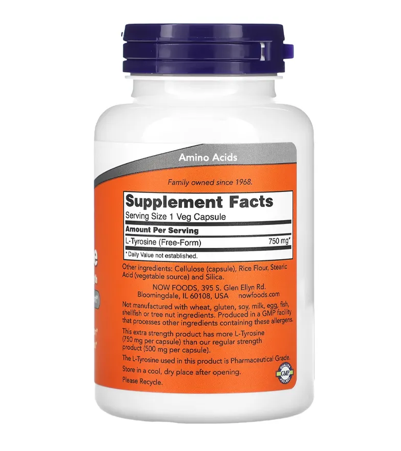 L-Tyrosine750 mg is a dietary supplement that provides the amino acid L-tyrosine, a precursor to several important neurotransmitters and hormones.