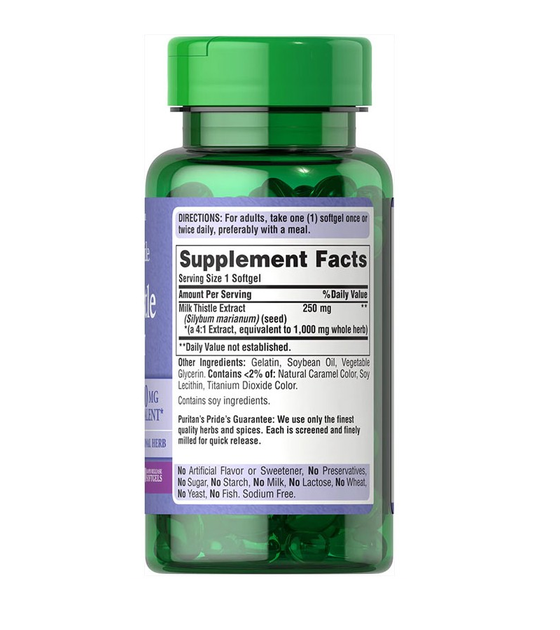 It contains 1000 mg of milk thistle extract with 80% silymarin, protects liver cells, promotes regeneration, and improves liver function