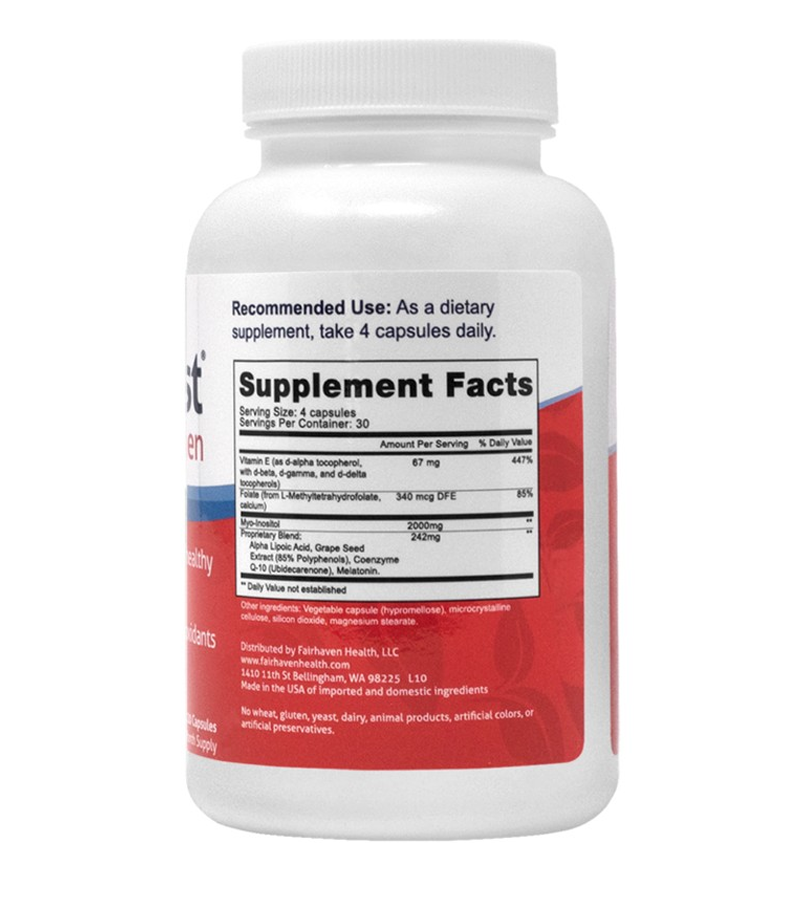 OvaBoost is a dietary supplement that contains a combination of vitamins and antioxidants including myo-inositol, folate, melatonin, coenzyme Q10, vitamin E, grapeseed extract and alpha-lipoic acid to support egg health and ovulation.